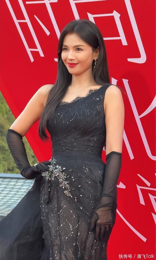 礼服黑色的网纱质地很显廉价感,本来上面碎钻还能增加点高级感,可偏偏手上又戴了两个手套,一下子质感就拉下来了。 而且站在这红色背景墙前面,把刘涛肤色衬得也非常黄,感觉年轻感都上去了。