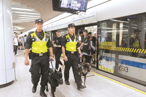 宋王缘(左)和顾晨瀚带着“幺幺”“薯条”去人民广场站执勤