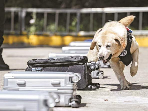 波音达警犬准备对行李箱嗅检