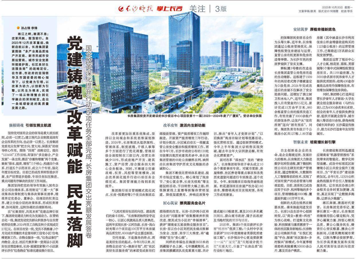 强根铸魂 引领发展主航道坚持党对国有企业的领导是重大政治原则,必须一以贯之;建立现代企业制度是国有企业改革的方向,也必须一以贯之。长房集团党委充分发挥“把方向、管大局、保落实”的领导核心作用,围绕“四商”战略定位,提出“123456”工作目标,即紧扣“多业融合、产业发展”一条主线、激活“存量和增量”两个变量、聚焦“降本、提质、增效”三个核心、构建四个体系、打造五个示范项目、成立六个专班,强化年度目标攻坚。目前已形成改革转型稳步开展、生产经营逐步趋稳、专项任务加压推进、重点问题有序解决的良好工作局面。集团坚持把党的领导有效融入国有企业公司治理体系,系统制定“三重一大”事项集体决策制度与集体决策事项清单,精准界定党委会、董事会、经理层的权责边界,建立分级分层的决策体系,形成权责清晰、协同高效、运转协调的治理新格局。在“长聚美好,共筑未来”党建品牌引领下,集团将党建活力转化为发展动力。在营销去化一线,集团发动党员群众积极参与全员营销劳动竞赛,2024年员工自购及转介实现成交2.7亿元。在项目攻坚一线,党员不畏酷暑,3个月完成市质量技术监督局职工住宅小区7台电梯更新工作。在物业服改革攻坚 激活内生新动能改革要更加注重系统集成,坚持以全局观念和系统思维谋划推进。2024年,长房集团从组织架构、管理体系、制度流程、干部人事等多个方面进行了优化调整,管理层级全面控制在三级以内,经营主体减少50%,形成房地产开发、建筑施工、资产经营、综合服务四大核心业务板块。同时,不断建立完善战略、权责、风控等管理模块,国企改革深化提升行动65项任务全部完成,集团管理能力得到系统提升。集团推行项目管理模式优化试点,长房·悦棠府等2个项目由集团总部提级管理。资产提质增效工作随即跟进,开展资产提质增效三年行动,计划分批次、分区域启动五一商圈直管公房安全整治和提质增效工作。而在今年7月,长沙市政府公布的120处市级第四批历史建筑名录中,由长房集团管理的66处公房赫然在列,映照出长房集团守护历史文化根脉的赤诚初心。集团不断优化营销体系建设,提升市场应变能力。精心策划了现房节、“安心置业季,长房无忧购”等主题促销活动,节日销售大幅上涨;积极探索线上直播等新媒体营销渠道,降低渠道费用,并响应政策号召,推出“青年人才安居计划”、“以旧换新”购房补贴计划等优惠活动,强化营销攻坚。通过创新营销模式,今年上半年集团大宗销售实现突破,超去年全年大宗回款总额,有效去化滞重资产。面对改革“深水区”里的“硬骨头”,长房集团领导班子牵头成立10余个重要事项专班,对城市更新、房屋维修、社区养老等重点事项和各类历史遗留问题进行专班推进、逐个攻坚。今年,青园路项目取得突破性进展,杜花嘉园项目房屋产权办证180余本,雅郡铭苑项目实现封顶,各项工作成效渐显。匠心筑家 擦亮服务金名片“人民对美好生活的向往,就是我们的奋斗目标。”长房集团始终坚守这一初心,以匠心筑就高品质人居典范,近两年实现长房·云河玖叙、长房·浅山时光等16个项目近100万平方米房屋高品质交付,6000余户业主喜迁新居。交付房屋,不是服务的终点,而是美好生活的起点。今年3月以来,长房物业启动“长+焕新计划”,把“社区美好生活服务商”的承诺变成街坊们摸得着的改变。长房·白沙湾小区将业主的“问题清单”收集整理并积极改进,使其成为小区的“幸福清单”,获评“湖南省五星级物业服务项目”。长房·东云台小区则把民生痛点拆解为安全、宜居、美学三大维度,将“磕绊路”变为“安心路”。同样的幸福也在海拔3933米的西藏隆子县上演。七年援藏期间,长房集团援藏团队攻克重重难题,共计建成超610栋建筑,惠及2000多名藏族同胞,获山南市政府、隆子县政府及当地村民的赞誉与感谢。2025年,集团4个项目获评长沙市“橘洲杯”优质工程;牛头村中学项目获评“2025年度湖南省芙蓉优质建设工程”;长沙视谷中心更是荣获第十一届“广厦奖”及“规划设计优秀奖”双项大奖,彰显了“长房品质”的行业标杆地位。安居筑梦 厚植幸福新底色把保障居民安居乐业作为头等大事。近年来,长房集团通过公租房管理优化、保障性租赁住房建设与运营、直管公房有机更新和危房改造等举措,为长沙市民的安居梦提供了坚实支撑。耕耘圃3号楼的改造是长房集团直管公房危房改造的生动缩影。这栋建于1939年的两层老式筒子楼被鉴定为D级危房,2024年完成改造后的房屋不仅解决了安全隐患问题,还增加了独立厨卫和水电入户。近年来,集团投入自有资金约3.5亿元,累计完成15万余平方米、980余栋直管公房的提质改造工作,有效改善了3000余租户的居住条件,让住户从“住有所居”迈向“居有所乐”。同时,集团负责市本级27个公租房小区共127栋、1.89万套房源(其中涵盖长沙市利用住房公积金增值收益购买的1123套公租房)的运营管理工作,已帮助近3万名群众实现安居梦想。集团还运营了视谷中心人才公寓、桂花里、蓉苑、芙蓉城等5个集中式保障性租赁住房项目,共1166套房源,为3000余名新市民和青年人才提供优质居所;收购436套存量商品房用作保障性住房,有效增加保障性住房供给。同时,集团精心打造并运营长沙青年人才驿站