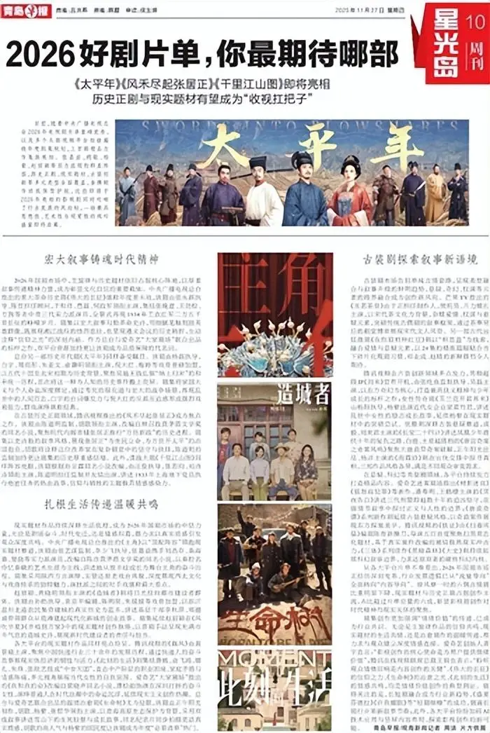 目前,随着中央广播电视总台2026年电视剧片单重磅发布,以及多个头部视频平台相继揭晓年度剧集规划,上百部精品力作集体亮相。张嘉益、胡歌、杨紫、赵丽颖等实力派领衔群星阵容,历史正剧、现实题材、古装创新等多元类型全面覆盖,金牌制作班底保驾护航,这些即将于2026年亮相的影视剧同时吹响了行业发展的风向标,一场兼具思想性、艺术性与观赏性的视听盛宴即将启幕。